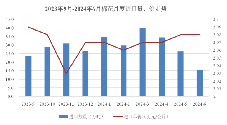 1-6月,纺织服装累计进口103.3亿美元,同比增长3.8%。其中纺织品进口54.8亿美元,增长2.6%,服装进口48.5亿美元,增长5.2%。大类商品中,纱线累计进口额增长7.9%,进口量增长13.7%,进口额、进口量增幅回落,单价同比下降5.1%。面料进口额同比下降1.7%,进口量下降0.5%,单价下降1.2%。针梭织服装进口额增长6.2%,进口量下降2%,单价增长8.4%。 6月,我国进口纺织服装16.6亿美元,同比下降6.5%。纺织品进口8.9亿美元,下降11.7%。纱线进口额下降17.9%,进口量下降16%,单价下降2.3%。面料进口额下降8.5%,进口量下降7.1%,单价下降1.5%。服装进口额7.7亿美元,增长0.2%。针梭织服装进口额下降2%,进口量下降8.6%,单价增长7.3%。2024年1-6月,我国累计进口棉花约179.4万吨,同比增长2.1倍。2023/24年度前十个月共进口288.7万吨,同比增长1.5倍。6月,根据中国棉花协会发布的信息,纺织市场淡季持续,需求不振,销售量不见好转,企业对市场信心不足,原料采购以补库为主,开机率小幅下调。我国棉花进口量环比下降,美棉仍居首位。据海关数据显示,我国进口棉花15.5万吨,环比下降40.3%,同比增长86.9%。其中,美棉占比达五成,排第一;巴西排第二,占比四成。