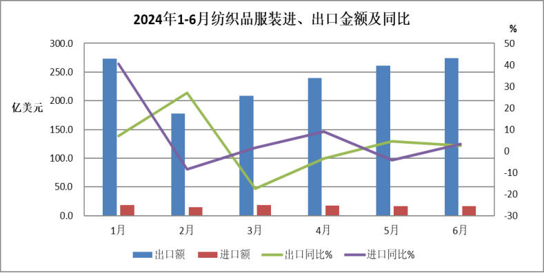 1-6月,我国纺织服装累计出口1432.4亿美元,同比增长1.6%,其中纺织品出口同比增长3.3%,服装出口持平。二季度纺织服装出口总体呈现逐月增长,稳中有进的态势。其中,5月单月出口额超260亿美元,同比增长4.5%。6月出口额274亿美元,环比连续四个月保持增长,同比实现2.5%的增长。