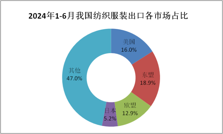 1-6月,我累计对美出口纺织服装同比增长5.1%,对东盟出口同比增长9.5%,对欧盟出口同比下降0.8%,对日本出口同比下降7.6%。四大市场美国、东盟、欧盟和日本占我出口的份额分别为16%、18.9%、12.9%和5.2%,四者合计占比为53%。对152个“一带一路”共建国家出口额为792.1亿美元,同比增长1.9%,占总体出口的55.3%。
