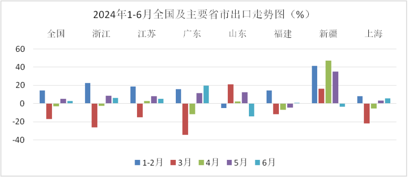1-6月,主要省市累计出口保持增长,其中浙江、江苏、山东和新疆分别增长3.7%、5.4%、1%和28.5%,广东、福建和上海同比微增0.1%、0.4%和0.1%。全国31个省(市、区,不含港、澳、台)中的16个实现出口增长,其中广西(28%)、陕西(40%)、黑龙江(31%)、西藏(106%)、贵州(47%)增幅较大。6月,排名前7的重点地区中浙江、江苏、广东、福建和上海分别增长5.8%、5%、19.4%、0.5%和5.4%。山东和新疆出口同比下降14.3%和4%。